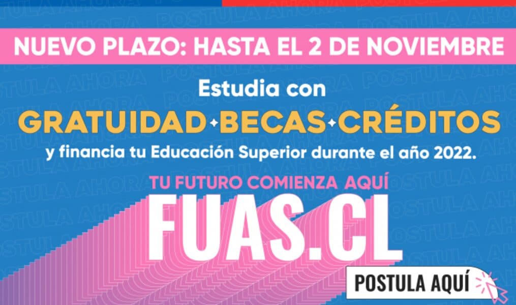 Con el objetivo de que todos los jóvenes que lo requieran tengan tiempo necesario para hacerlo, el Ministerio de Educación extendió el proceso de postulación a la gratuidad, becas y/o créditos para la educación superior 2022, hasta el próximo martes 2 de noviembre a las 14:00 horas. En este proceso, los estudiantes que no cuentan con ayudas estudiantiles o que deseen eventualmente mejorar sus actuales beneficios, podrán completar el Formulario Único de Acreditación Socioeconómica (FUAS) en http://www.fuas.cl/ y así estar postulando a todos los beneficios estudiantiles del Estado.