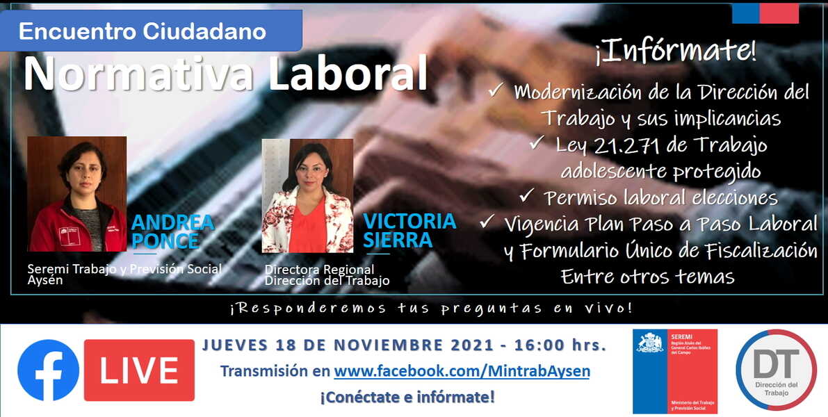 “Debido a la pandemia han surgido diversos temas laborales y actualizaciones en las leyes que atañen tanto a trabajadores como a empleadores y a la comunidad en general, y es en este sentido nuestro deber estar constantemente informando y aclarando dudas. El Facebook live nos ha entregado la posibilidad de conectarnos con la comunidad y responder todas las preguntas en vivo y que las personas se puedan conectar desde distintos puntos de nuestra Región de Aysén. Para este jueves los invitamos a las 16:00 hrs, donde estaremos con la Directora Regional del Trabajo conversando sobre la Modernización de la Dirección del Trabajo y sus implicancias, la modificación a la ley sobre el adolescente trabajador; el permiso laboral para que los trabajadores voten este domingo, además de la vigencia del Formulario Único de Fiscalización para disminuir los riesgos de contagio de Covid 19. Son temas que se han ido actualizando y que es de suma importancia que todos estén informados. Los esperamos en www.facebook.com/mintrabAysén. Teniendo en cuenta que además quedará la grabación para que luego puedan revisarla”, afirmó la Seremi del Trabajo y Previsión Social, Andrea Ponce.