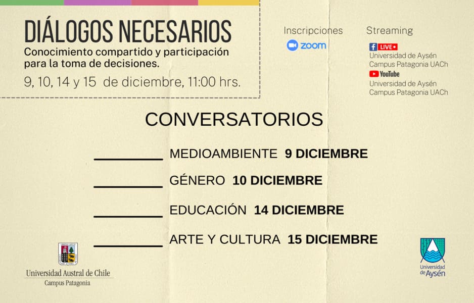 Las próximas elecciones presidenciales son, sin lugar a dudas, un hito relevante a nivel país que compromete a todos y todas. Ante la contingencia las dos universidades presentes en la región, la Universidad de Aysén y el Campus Patagonia de la Universidad Austral de Chile, se han propuesto el desafío de realizar de forma conjunta el ciclo de conversatorios «Diálogos necesarios: Conocimiento compartido y participación para la toma de decisiones».