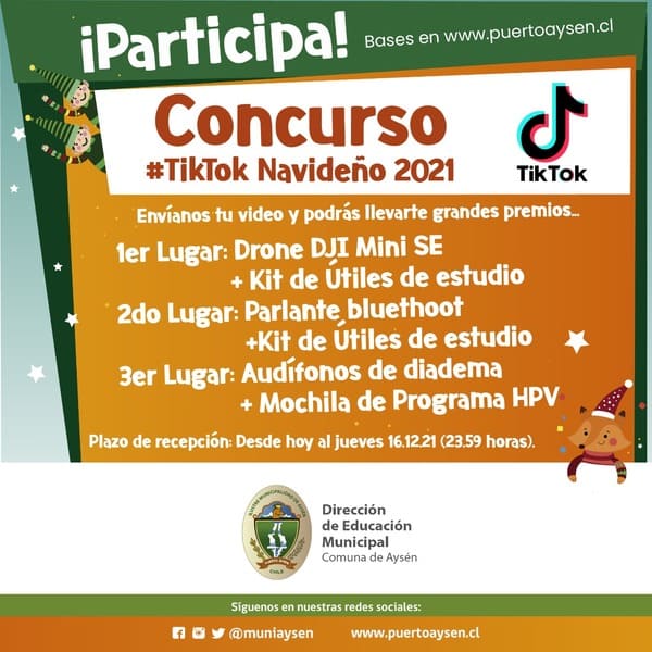 Se trata del denominado “TikTok Navideño 2021”, concurso que por estos días está promocionando el DEM Aysén, y que tiene por objetivo congregar a la familia estudiantil alrededor de la festividad que ya se acerca, en una popular plataforma de compartición de videos como es la de tiktok.