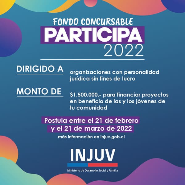 El Instituto Nacional de la Juventud (INJUV) inició hoy las postulaciones para acceder al Fondo Participa 2022, un financiamiento concursable al que pueden postular juntas de vecinos y organizaciones comunitarias, territoriales o funcionales que se encuentren constituidas como personas jurídicas sin fines de lucro.