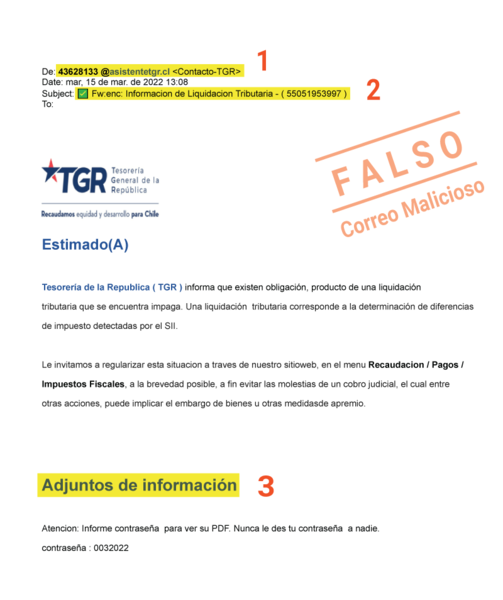 Una nueva campaña de correos electrónicos falsos, que intentan suplantar la imagen de Tesorería General de la República, informando a los contribuyentes sobre supuestas deudas o “liquidación tributaria”, reportó TGR luego de recibir múltiples consultas de los usuarios. Por ello, el Tesorero Regional Juan Andrés Galilea llamó a no abrir los archivos ni considerar estos mensajes, que buscan obtener la información privada de los contactados, utilizando la imagen tanto de TGR como del Servicio de Impuestos Internos.
