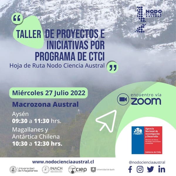 De esta manera, abrió una nueva oportunidad de participación a través del “Taller de Proyectos e Iniciativas por Programa de CTCI” que se llevará a cabo mañana miércoles 27 de julio en los siguientes horarios: de 09:30 a 11:30 horas (Aysén) y de 10:30 a 12:30 horas (Magallanes). Las inscripciones para este encuentro, que se realizará a través de la plataforma zoom, son en el siguiente link: