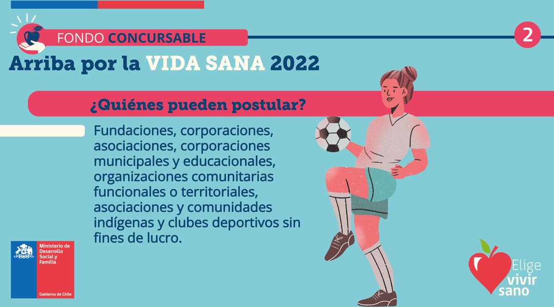 Para más información, bases de postulación, y la documentación necesaria para postular al Fondo “Arriba la Vida Sana”, la pueden encontrar en la página Web de Elige Vivir Sano en www.eligevivirsano.gob.cl en la sección “Fondos Concursables.