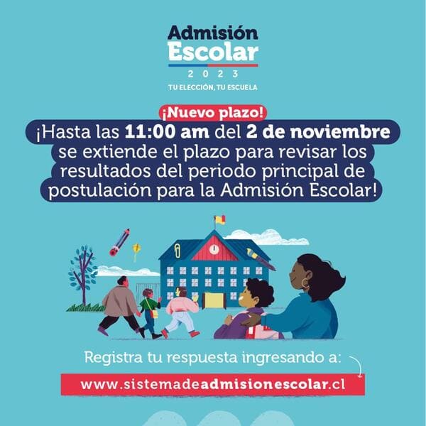 El Ministerio de Educación informó este viernes que extenderá el plazo para revisar los resultados del periodo principal de postulación para la Admisión Escolar del año académico 2023 hasta el miércoles 2 de noviembre a las 11:00:00 horas. Hasta esa fecha, las y los apoderados podrán revisar estos resultados a través de la plataforma web www.sistemadeadmisionescolar.cl ingresando con las credenciales de usuario creadas al momento de postular.