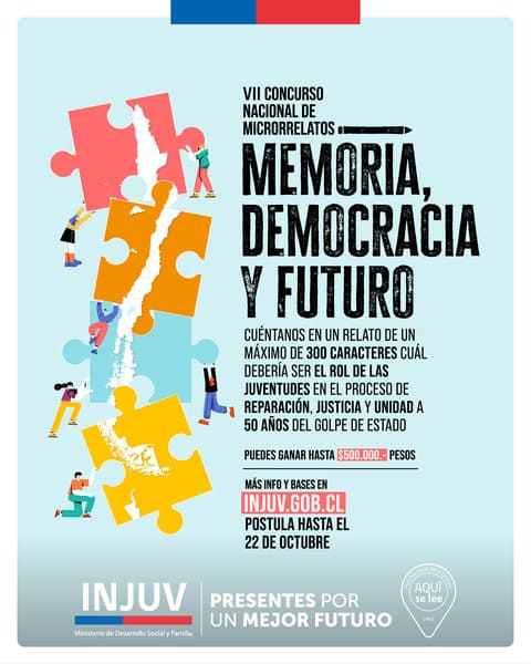 El Instituto Nacional de la Juventud (INJUV) lanzó la versión 2023 del VII Concurso Nacional de Microrrelatos, iniciativa que está contemplada dentro del Plan Nacional de Lectura y cuyo tema para este año es “Memoria, Democracia y Futuro. Rol de las juventudes en el proceso de reparación, justicia y unidad a 50 años del Golpe de Estado”.