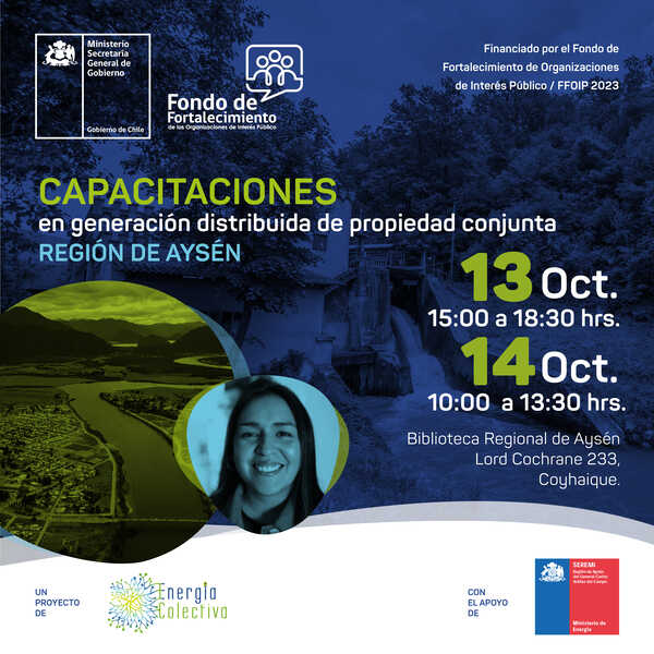 Es en este contexto que la ONG Energía Colectiva, realizará una capacitación gratuita sobre el diseño e implementación de proyectos de generación distribuida de propiedad conjunta en la Región de Aysén. La actividad será el viernes 13 de octubre de 15:00 a 18:30 hrs y sábado 14 de octubre de 10:00 a 13:30 hrs., en la Biblioteca Regional de Aysén, Lord Cochrane 233, Coyhaique. Las inscripciones se realizan completando el formulario de inscripción en las redes sociales @Energia.colectiva y los cupos son limitados.