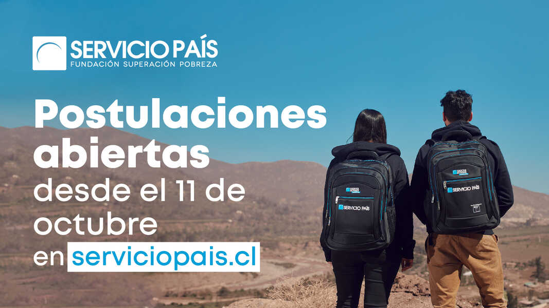 Hasta el 11 de noviembre estarán abiertas las postulaciones al programa SERVICIO PAÍS de la Fundación Superación de la Pobreza. Esta iniciativa destina a jóvenes profesionales y técnicos de diversas disciplinas a las 16 regiones del país, para aportar al desarrollo local de lugares con alto índice de vulnerabilidad y aislamiento, que cuentan con un gran potencial desde el punto de vista natural, cultural, social y económico.