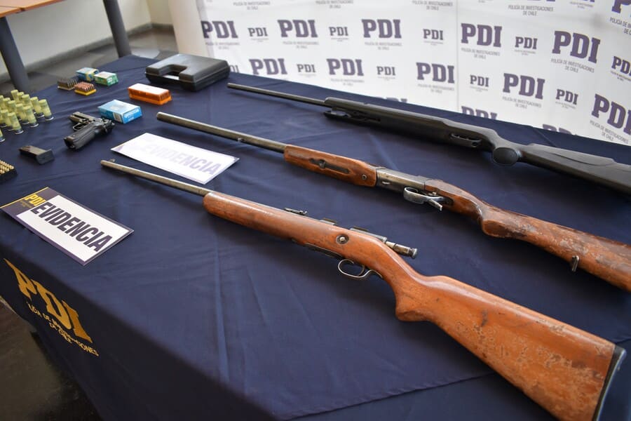 De acuerdo a lo informado por la PDI, las especies incautadas en el operativo policial corresponden a una escopeta, marca Baikal, calibre 12; un rifle, marca Winchester, calibre .22 largo; un rifle de aire comprimido, marca Crosman; una pistola de fantasía, marca Bruni, modelo 92; postones y 40 cartuchos calibre .12, 48 cartuchos 9 mm de salva y 214 cartucho calibre .22, todos sin percutir.