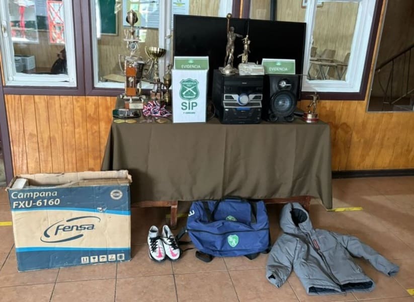 El procedimiento apoyado por la Sección de Investigación Policial (SIP), permitió verificar su identidad, pudiendo constatar que el individuo mantenía en su poder un equipo musical, un televisor, zapatos de fútbol, indumentaria e inclusive trofeos y medallas obtenidas por el club deportivo, de las cuales no pudo acreditar su pertenencia, según indicó el Capitán Maureira.