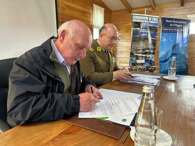 En una fría jornada y con un minuto de silencio en memoria del Teniente Emmanuel Sánchez Soto (QEPD) fallecido en un procedimiento policial en la Comuna de Quinta Normal, Carabineros Aysén a través de su Jefe de Zona, General Patricio Santos Poblete y el Alcalde de la Comuna de O’Higgins José Fica Gómez suscribieron la firma del convenio de colaboración OS-14 orientado a potenciar un trabajo conjunto y patrullajes mixtos con la finalidad de brindar más seguridad y protección a la comunidad que hace patria en la comuna más austral de la región de Aysén.
