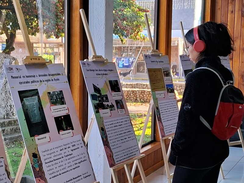Carla Romo, enfatizó que la exposición, permite “mostrar parte del patrimonio histórico en materia de memoria, verdad y justicia, destacando el sitio de memoria que tenemos acá en Puerto Aysén y la casa de la señora Eduvigis Soto, que fue una gran defensora de los derechos humanos, que está en el sector Pedro Aguirre Cerda. Así también, compartir con los asistentes, otras placas conmemorativas y memoriales que existen en la región en materia de verdad y justicia. Destacar la figura de Bernardita Villegas Almonacid, que fue seleccionada entre las 16 mujeres influyentes en materia de derechos humanos por el instituto este año 2024”.