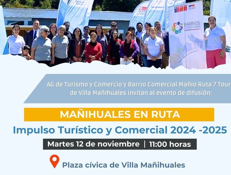El encuentro se realizará el martes 12 de noviembre en Villa Mañihuales, donde el Barrio Comercial Mañio Ruta 7 Sur dará a conocer los avances logrados en el marco del segundo año de ejecución del programa Barrios Comerciales de SERCOTEC, en colaboración con la División de Asociatividad y Cooperativas- DAES, el Ministerio de Economía y la Ilustre Municipalidad de Aysén.