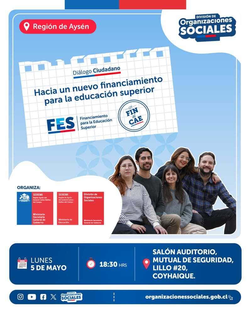Este lunes 5 de mayo a las 18:30 horas en el auditorio de la Mutual de Seguridad, ubicado en Lillo N° 20, Coyhaique, la Seremi de Gobierno Úrsula Mix Jiménez junto al Seremi de Educación (S) Claudio Rivera Zbinden, realizarán el primer encuentro abierto a la comunidad «Hacia un nuevo financiamiento para la educación superior», donde se entregará información sobre el proyecto de ley que propone terminar con el Crédito con Aval del Estado (CAE) y reemplazarlo por un nuevo sistema de financiamiento público.