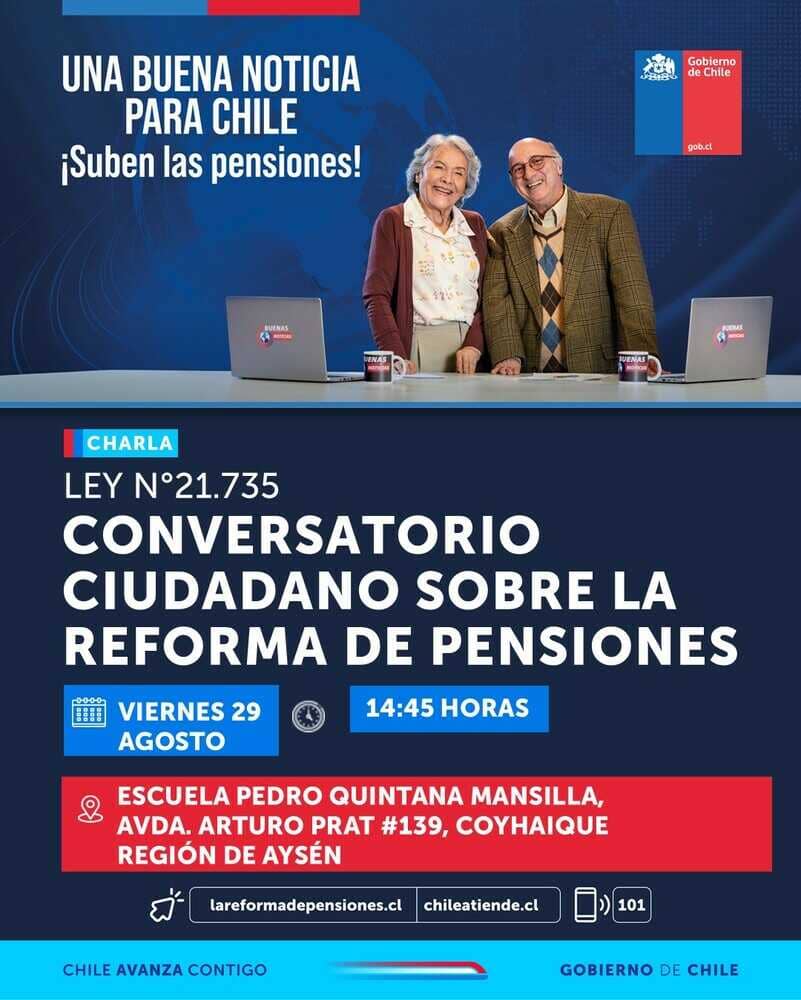 Sobre la instancia, el Delegado presidencial regional de Aysén, Jorge Díaz Guzmán convocó a la comunidad a participar, “Queremos invitar a la comunidad, a los clubes de adultos mayores a dirigentes sociales, para que nos juntemos el día viernes en la tarde en la Escuela Pedro Quintana, para conversar respecto de la reforma previsional. Ya en el mes de septiembre comienza la primera etapa de beneficios de esta reforma y por lo tanto, queremos informar a todos y todas para que puedan tener esos antecedentes. También, cómo se va a ir desarrollando durante el año 2026- 2027, en cada una de las etapas que tiene este proyecto, que fue aprobado y es iniciativa de nuestro Gobierno. Por lo tanto, quedan todos invitados e invitadas a que nos juntemos, donde estaremos con nuestra Subsecretaria de Desarrollo Regional, conversando respecto de esta importante materia, que a todos nos interesa”.