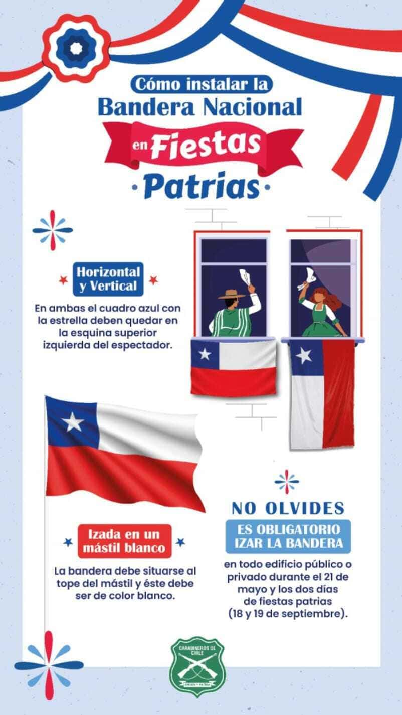 A pocas horas del inicio de Fiestas Patrias, Carabineros de Chile recuerda a la comunidad la correcta forma de instalar el pabellón nacional, cuyo izamiento es obligatorio los días 18 y 19 de septiembre.