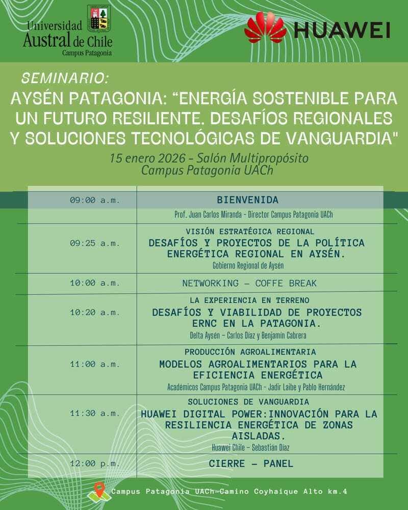 El Campus Patagonia de la Universidad Austral de Chile y la empresa Huawei, líder global en el sector de la energía digital, organizaron el seminario “Aysén Patagonia: Energía Sostenible para un Futuro Resiliente. Desafíos Regionales y Soluciones Tecnológicas de Vanguardia”, a realizarse el día 15 de enero en dependencias de la casa de estudios en Coyhaique.
