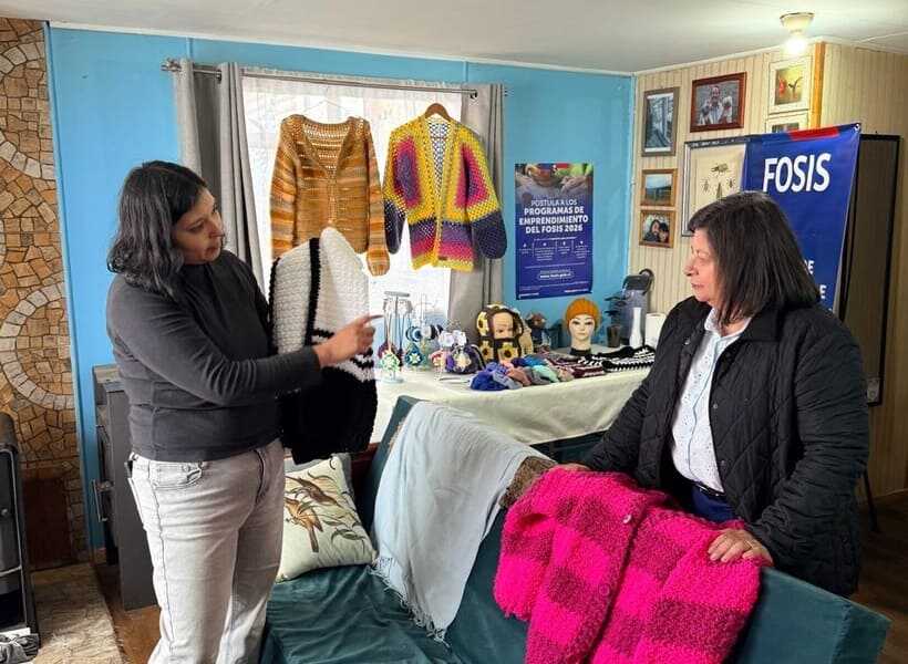 La seremi de Desarrollo Social y Familia, Marcia Raphael Mora, visitó a la emprendedora Fiamett Soriano, dueña de Polaris Teje y Maneje, que confecciona a crochet distintas prendas y accesorios, para conocer el impacto de los apoyos del Servicio.